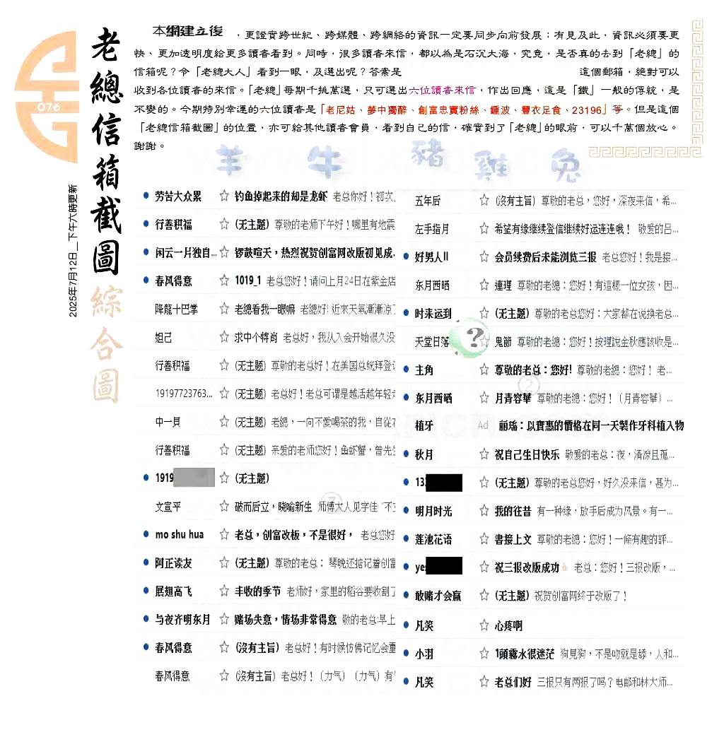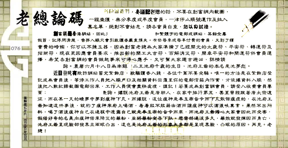 | 主题 :076期:六合皇金句/老总论码/萧公子/林大师/五行夺码/老总信箱截 |