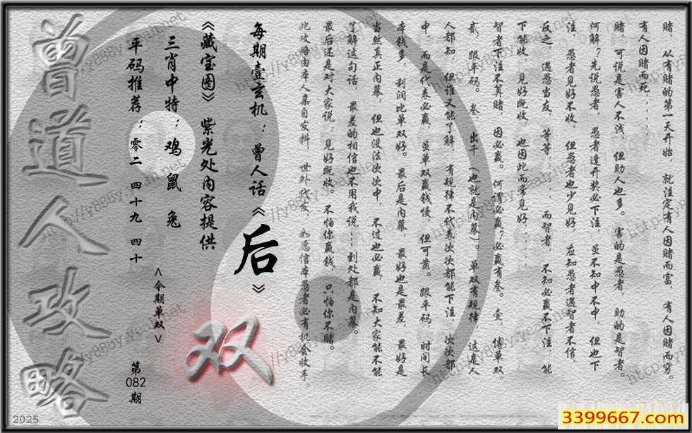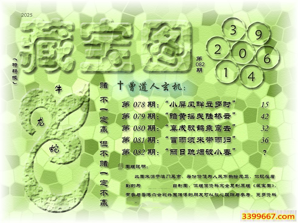 | 主题 :082期藏寶圖 新:丽日疏烟破小春 老:几年冷落江南夜 禁:猪 禁:5尾 |