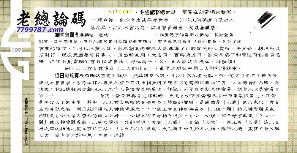 | 主题 :109期:六合皇金句/老总论码/萧公子/林大师/五行夺码/老总信箱截 |