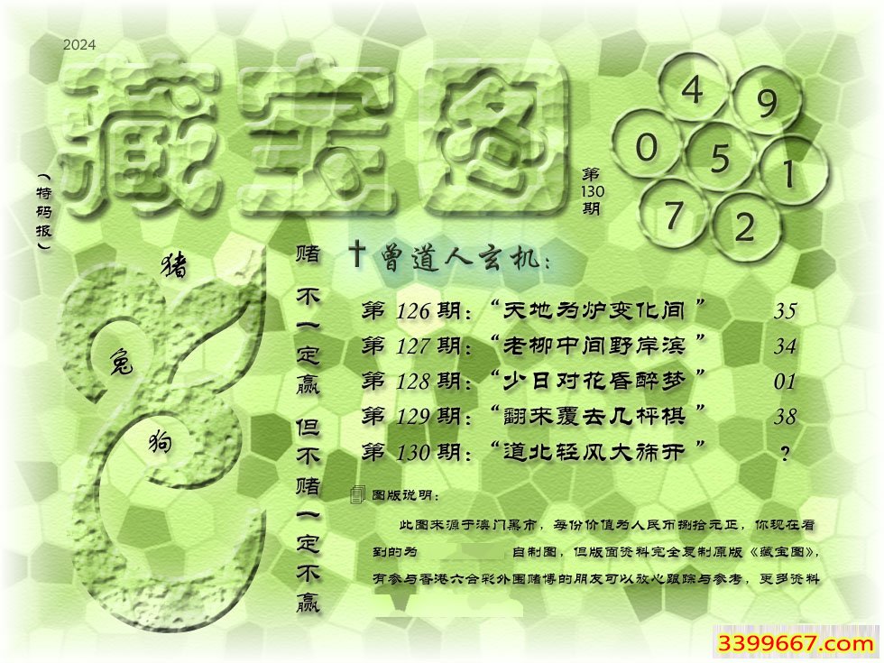 | 主题 :130期藏寶圖 新:道北轻风旆大开 老:流出西湖载歌舞 禁:猴 禁:6尾 |